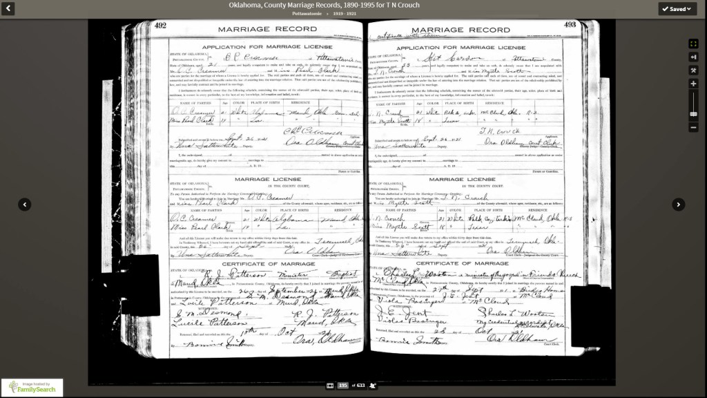 Thomas Newton Crouch married Myrtle Scott (1903-1988) in McLoud, Oklahoma, on September 27, 1921, when he was 21 years old. They had 10 children together.